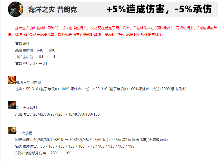 通过对被动和E技能的减速增加一个暴击加成想重新使船长出回暴击装,极地里我目前看到的船长大多都是暴击套,所以改动前后的主要区别是现在火刀会更疼,E技能前期暴击没起来的时候会减速效果略微减少,桶的基础伤害增加但暴击时的伤害减少,至于基础属性上的改动会减少船长峡谷里的对线容错,极地里则可以忽略不计(甚至后期血量还会多100+)。改版后的船长乱斗出装推荐吸蓝刀之后裸2-3个暴击斗篷后再慢慢一件一件合大件。(分别做收集者、多米尼克和无尽)