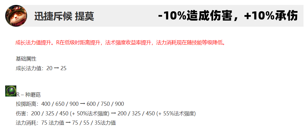 改动解析:改动后的提莫一级大招范围直追上版本两级大招,同时蘑菇AP收益提高5%,蓝耗也会随着大招等级减少,再搭配上基础属性里的成长法力值加成,后期蘑菇丢着丢着没蓝的情况会大幅减少,总的来说大乱斗里的提莫更好过渡到技能急速和大招等级起来疯狂炸兵线的阶段了。