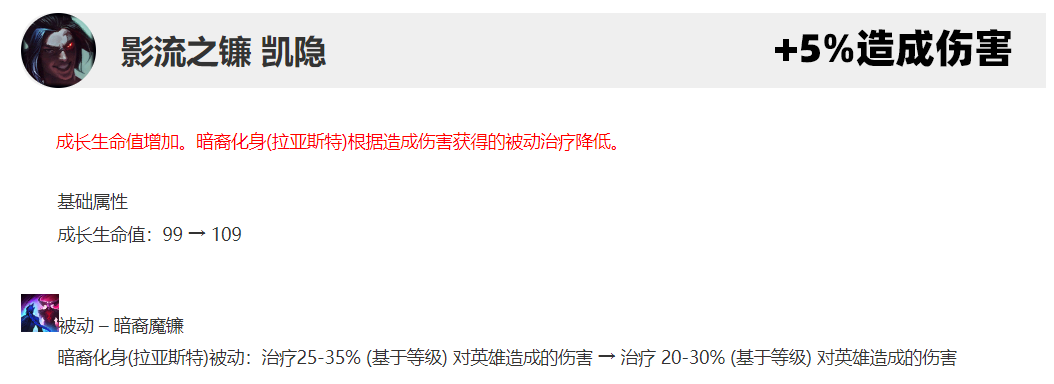 改动解析:和剑魔类似的改动,增加10点成长生命值但是减少红凯被动全等级吸血量,虽然看起来是全等级减少,比剑魔的要惨一点,但要注意的是,凯隐在极地中变身往往要6-7级,如果对面丢丢怪较多三级没打一波大团那么进化的节点还要更晚,算下来也和剑魔削弱的节点差不多,红凯出星蚀/渴血+魔宗+死舞在极地里算是T1的战士了,这次改动对他的强度影响不大。