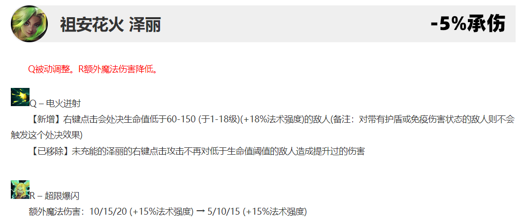 改动解析:比赛上过于强势的表现导致的削弱,原本右键的攻击是会对35%血以下的目标造成6倍伤害,通常能A出2-3下,现在改为处决效果只能在丝血的时候造成额外伤害,整体伤害减少但多一个拿头的机制,大招也是全等级电刀效果减少5点伤害。总的来说泽丽制造伤害能力减少但右键K头能力增加。