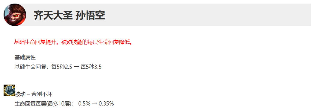 改动解析:这个改动就是把被动的生命回复转移至了基础的生命回复,不打架时候的回复量变多,生命值起来后被动叠满回复量变少,算个微调,整体影响不大,猴子在大乱斗依旧强势。