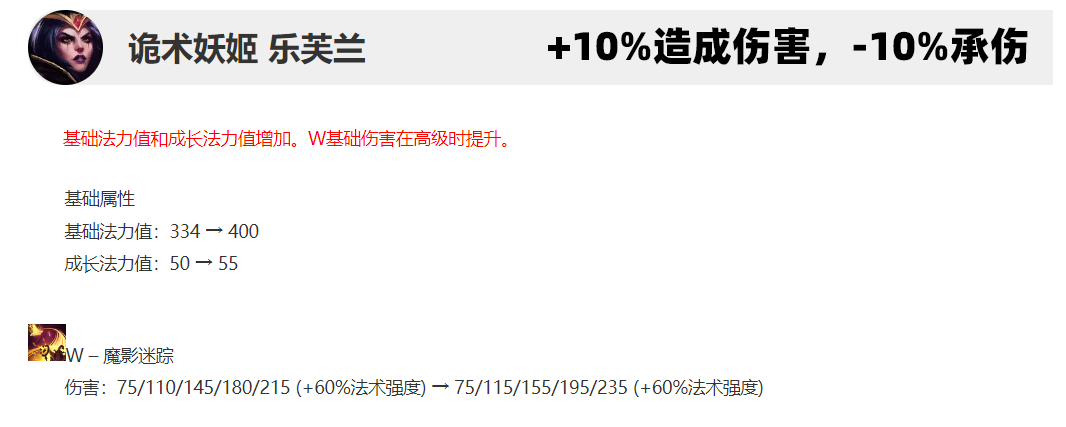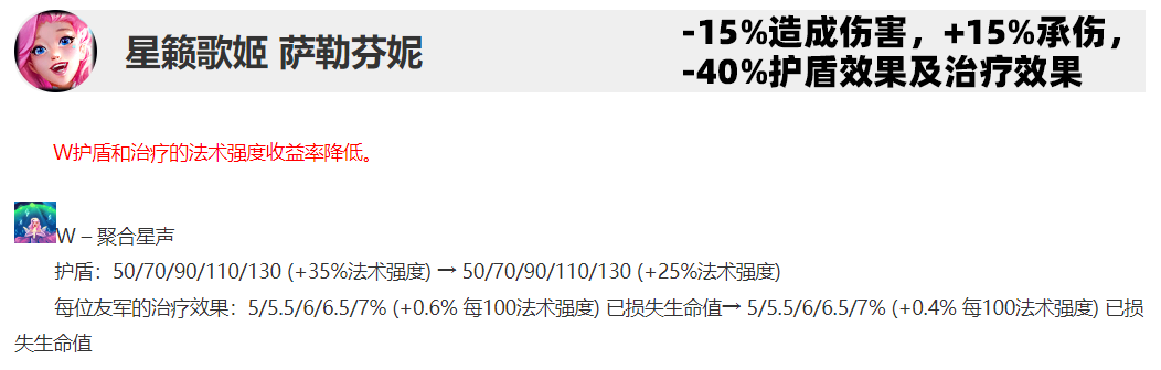 改动解析:和猫咪一样,略微减少W技能护盾和治疗效果的AP收益,看起来影响不大,但是搭配软辅装备的削弱奶量影响还是挺明显的,最最最重要的是萨勒芬妮本身就在极地中有-40%护盾和治疗量效果的DEBUFF,强烈推荐大家出装要不出皇冠主打功能性要不就走面具冰杖走ap。