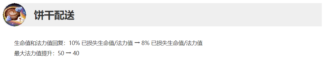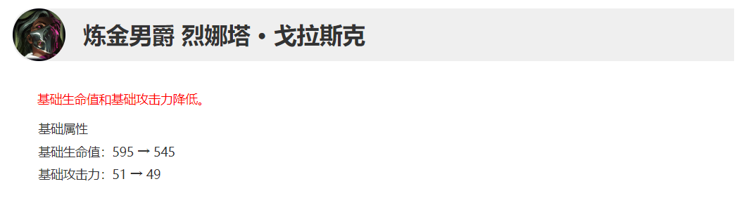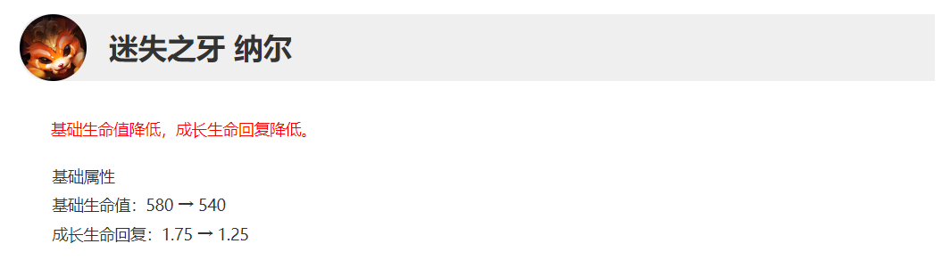 改动解析:基础生命值减少40点,成长生命回复减少0.5,和船长的基础属性改动类似,耐久度更新后其在比赛上大火,设计师决定增加其对线难度让他更难渡过对线期达到削弱目的,极地里虽然不存在对线期的说法但毕竟是少了40点血,总归是削弱了。