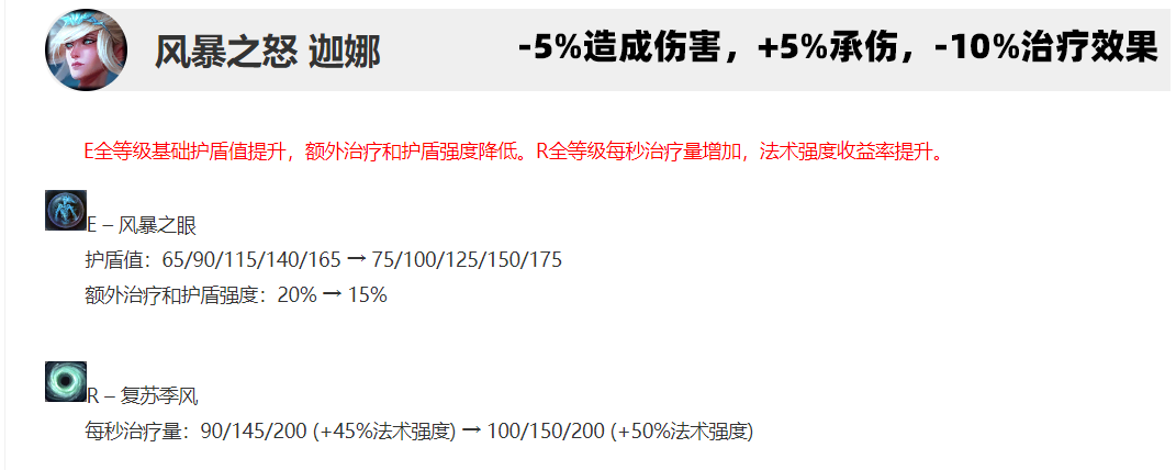 改动解析:和前面几位软辅一样,减少护盾值和治疗、护盾效率,不过风女的大招AP收益还偷偷加了5%。