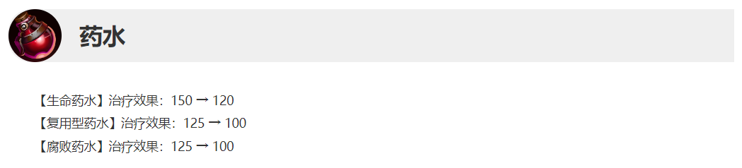 改动解析:设计师本意是通过消耗品的削弱增加对线期的击杀,在极地里相信大家也就出门买买血药或复用性药水,腐败药水笔者更是见都没见过,对极地影响不大,或者说买血药的优先级更低了。