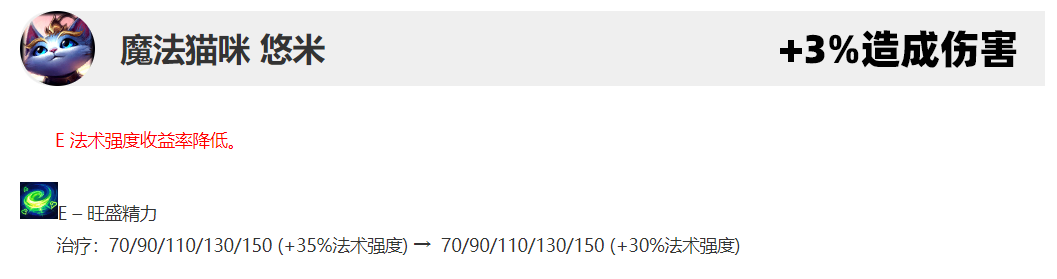 改动解析:E技能治疗量AP收益减少5%,看起来不多但是配合下文的装备改动对奶猫的影响还是比较大的,版本更新后推荐大家极地里出卢登走法猫。