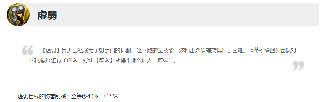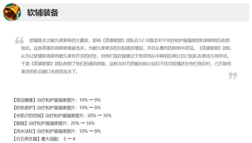 改动解析:耐久度更新后峡谷和比赛里软辅的登场率集体升高,削弱是必然,算是耐久度更新后的补充更新。