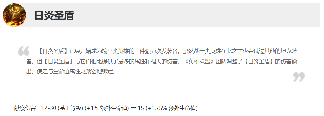 改动解析:破败日炎的出装有点被滥用引来的削弱(亚索、永恩、卑尔维斯),减少了日炎的基础伤害,增加了额外生命值收益,但不影响破败+肉神话这一思路,日炎削了咱还可以用霜火护手,况且日炎本来也不是用来打伤害的,神话属性里加的韧性也非常重要,这两装备的组合并不是说日炎太imba而是破败的百分比伤害会更加适合耐久度更新后的高血量版本。