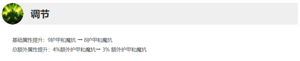 改动解析:耐久度更新给全英雄提供双抗后的漏网之鱼,让其性价比过于高了,极地里的调节生效时间不是峡谷里的12分钟而是8分钟。