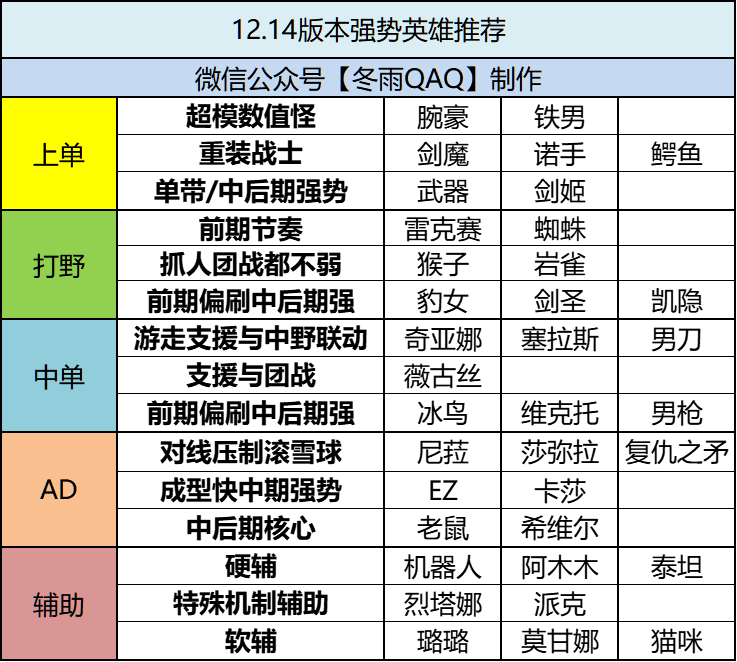 接下来,结合版本生态和胜率统计,说一下为啥会推荐这些英雄。想学习更多英雄套路,了解双排开黑套路,学习快速上分的方法,可以关注我们的公众号【冬雨QAQ】获取更多独家教学