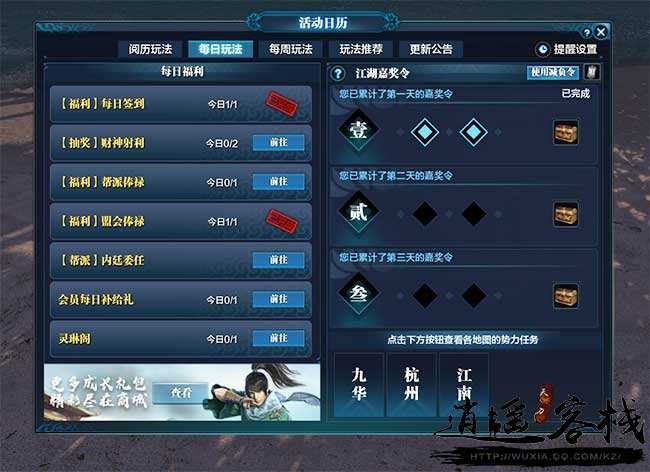 1、界面改动。现在的势力日常界面中相当于一个任务列表,按照盟会日常、财星相照、海政任务等排列,大家无法直观的看到每个任务的具体地点和位置。而在新版本中的界面,增加了任务地图按钮,点击后可以快速查看每日刷新的势力任务及其具体地点,例如点击江南就会打开江南地图,并在地图中显示三个势力任务的位置,非常方便。