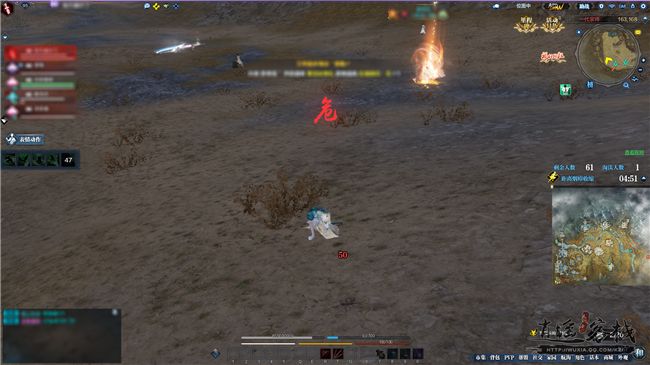 右下角见方小地图上端,会显示本场竞技剩余玩家人数、自己击败并视作被淘汰的玩家人数,以及烟瘴收缩倒计时提醒等信息。烟瘴是“一代宗师”战场中的特殊环境设置,可以简单理解为不断收拢的剧毒区域,玩家步入其中会不断损失气血直至战败离场。在地图上显示为蓝色圆圈的是安全区域,而黄色圆圈则代表着烟瘴,玩家需要尽可能地远离烟瘴前往安全区域落脚,随着烟瘴不断收拢,安全区域也会渐次缩小,这意味着参战侠士终会有狭路相逢的一刻。