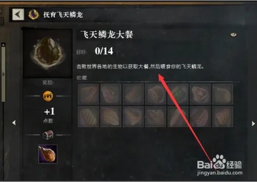继续做抚育飞天鳞龙,这里需要击败怪物,然后进行投食给飞天鳞龙,一共14个。