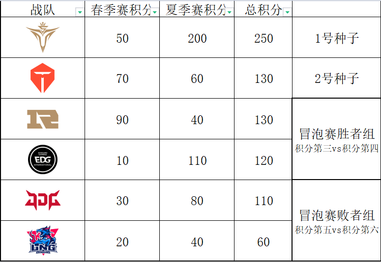 这里还可以分享一个TES一个BO5不赢都能进世界赛的特殊情况,假设TES季后赛连输2个BO5止步第四名,世界赛积分定格在130,如果最终是V5夺冠,EDG夺得亚军,JDG获得第三名,其他战队随意。此时TES的世界赛积分依旧是第二,能拿到2号种子直通世界赛。