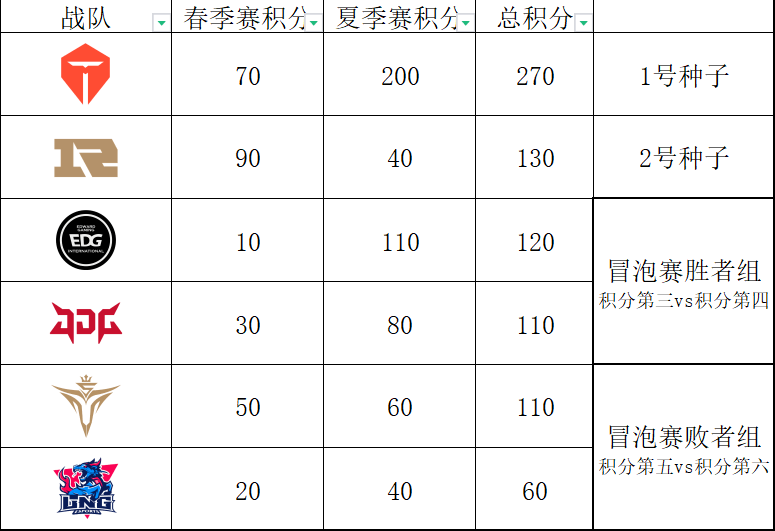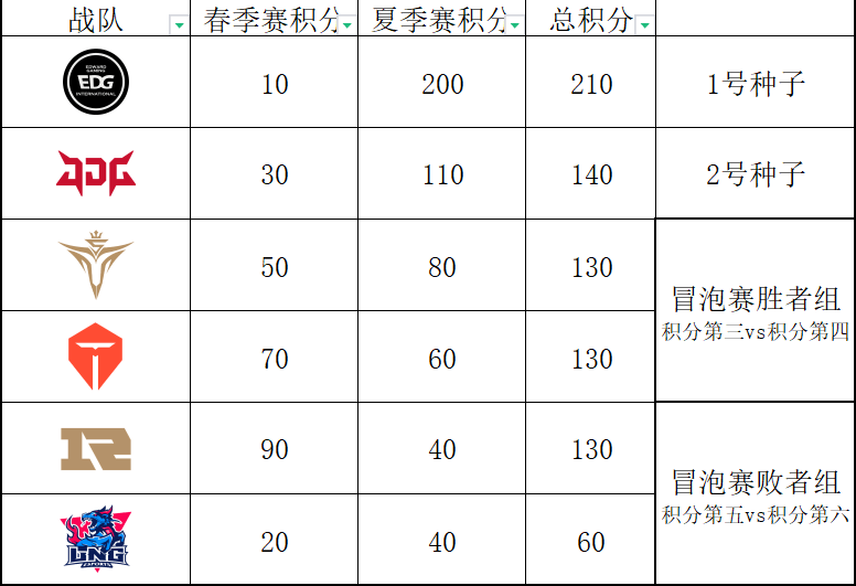 RNG的情况和TES很类似,RNG也存在一个BO5都不赢却能进世界赛的情况,假设RNG季后赛一轮游止步六强,世界赛积分定格在130,如果最终是TES夺冠,EDG夺得亚军,JDG获得第三名,其他战队随意。此时RNG的世界赛积分依旧是第二,能拿到2号种子直通世界赛。