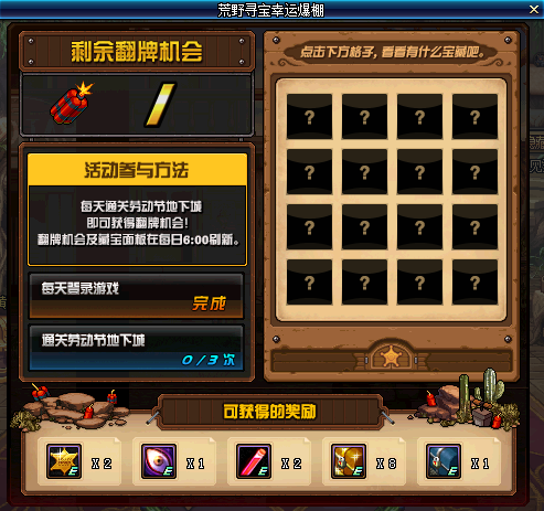 本次翻牌可获得的奖励以及数量都会显示在下方,所有格子都抽完必定能抽到下方所有奖励。但是每天限定翻4次,而牌子每天6点重置,也就是必须翻到炸药才可以拿走大部分奖励。