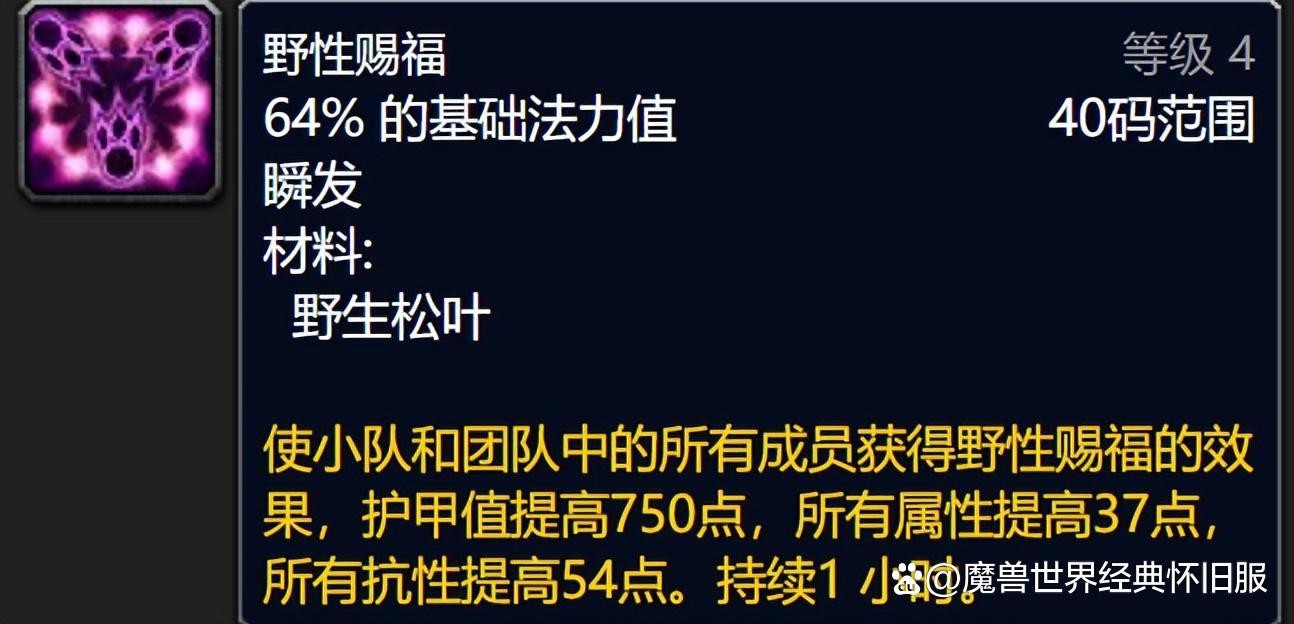 德鲁伊强化野性赐福也是无可替代的,全属性加成可与王者祝福叠加,制皮专业狂野战鼓可代替未强化的野性赐福。