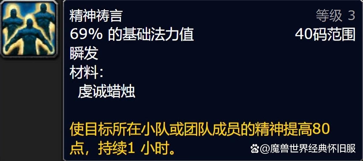 牧师精神祷言与痛苦术狗BUFF不叠加,两者皆可通过天赋强化,牧师效果更佳,值得一提的是WLK牧师无需用天赋点出精神祷言,三系牧师皆可。