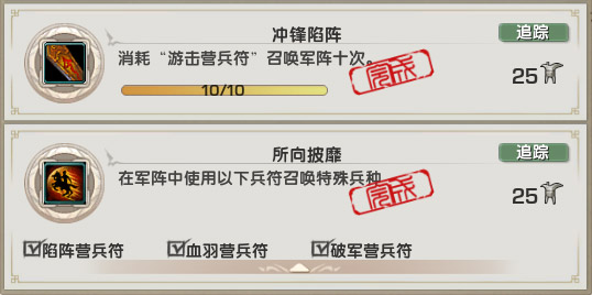 需要注意的是,这个任务的奖励是有几率的,可能会获得绑定的【游击营兵符】或不绑定的特殊兵符【陷阵营兵符】、【血羽营兵符】、【破军营兵符】