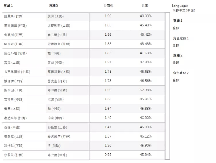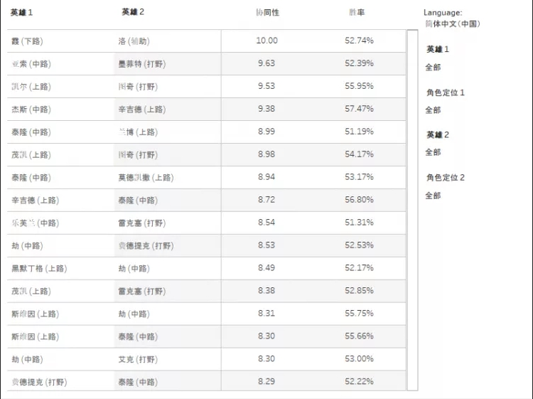 对于拥有最好的整体协同效应的英雄组合,首先想到的便是霞和洛这对英雄组合,这一点并不令人惊讶。这对组合是被安排在一起出现的,所以他们是最主要的最有优势的一对组合,这是合情合理的。同样,排名第二和第三的优胜组合也有一些明显的协同作用,仅仅看到他们的名字你就会想到他们搭配使用可以发挥怎样的效果。亚索(中单)和墨菲特(打野)凭借他们能让敌人瞬间爆炸的恐怖的组合技能位居第二,而凯尔(上单)和图奇(打野)则以他们让人畏惧的Gank能力和生存能力占据了第三位。