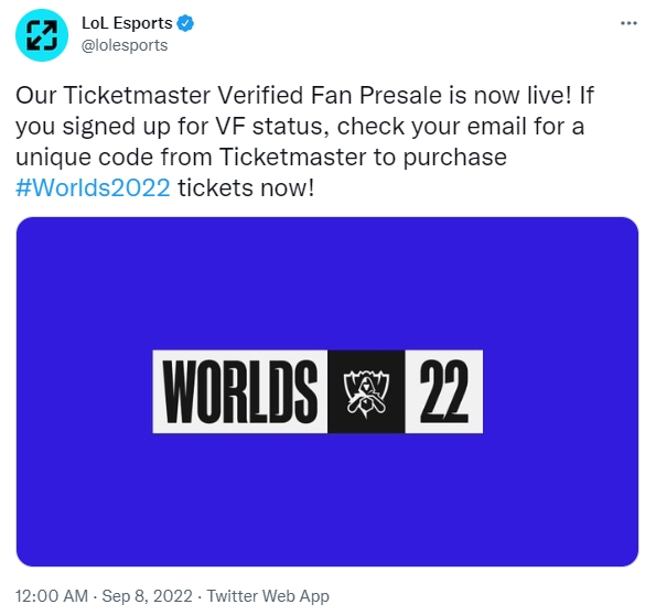凌晨LOL官方在推特上正式宣布了S12小组赛、1/4决赛及半决赛阶段的门票预售正式开启。目前只有此前注册过信息并被抽中获得verified粉丝预售码的玩家可以**门票。门票正式开售则要等到北京时间9月9日0点。