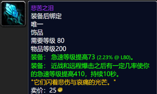 悲苦之泪由风暴峭壁初生的瓦格里小概率掉落(3.3.5数据库显示掉率为0.05%),急速是WLK P1阶段强势职业增强萨、刺杀贼和邪DK第一副属性,个人预测悲苦之泪WLK初期价格甚至可能会超过伟大卡片,成为WLK初期最贵装绑。