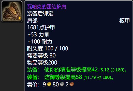精准在WLK并不是什么稀缺属性,对于版本初期的坦克来说价值还不如命中,瓦帕克的团结护肩唯一优势就是DKT和盾T都能用,销路比较广。