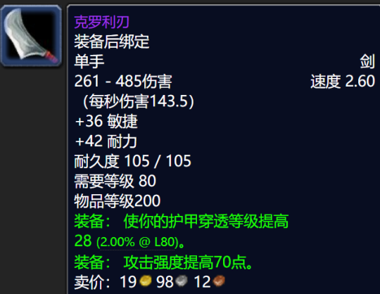 60级近战大菜刀克罗之刃的升级版,2.6的攻速和破甲属性销路更广,冰DK也能用。