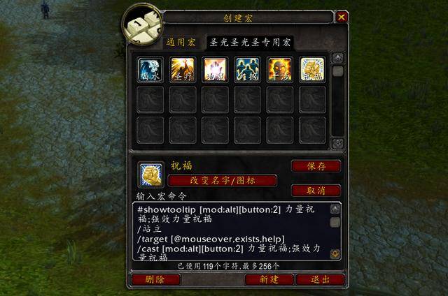这个宏很方便,给鼠标指向的目标左键加小力量,右键加大力量,其他祝福可以自行改技能名称。