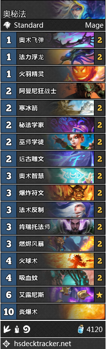 这礼拜法师过得很不错,因为奥秘法彻底火了。奥秘法的构筑变化空间不大,有27-28张卡都是核心卡。可以添加或减少的卡有:火羽精灵、阿曼尼狂战士、血法师、镜像实体、奥数锁匠。