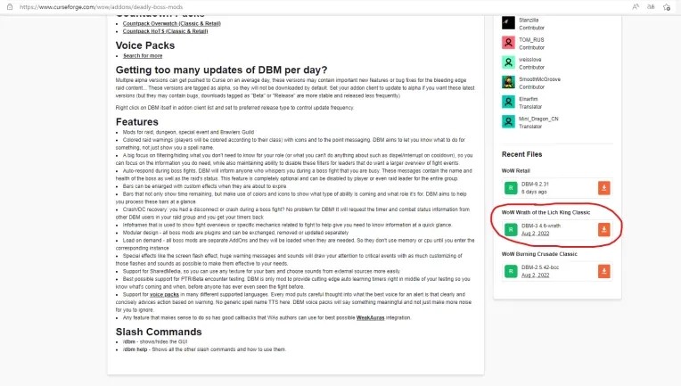 比如我进DBM页面,在网页右下侧有一个下载插件的地方,如图所示,红圈位置就是对应WLK的DBM插件,进去后就可以直接下载了。