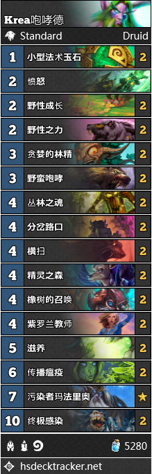 最后,咆哮德虽然在天梯上不多见,但战绩不错。这套卡组是Krea的一套最新版本的构筑。当然,在面对术士的时候,咆哮德还是施展不开。