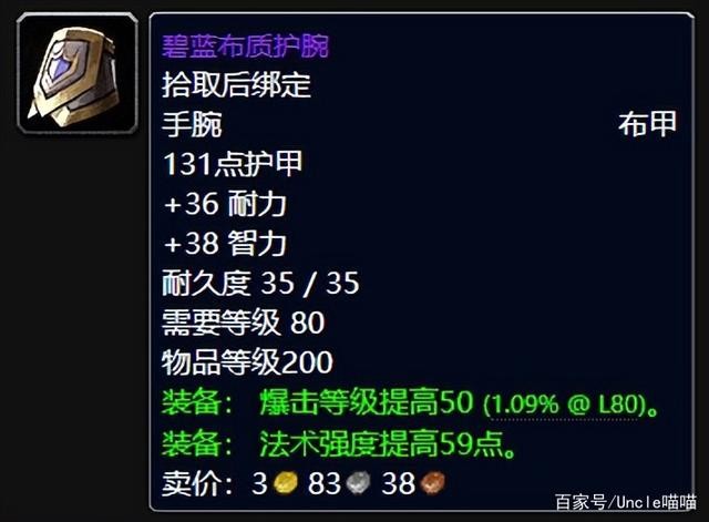 不知为何,WLK年代的大多数布甲输出装都是高爆击等级提高的,这也是让火法玩家乐开了花,此款紫罗兰监狱出品的碧蓝布质护腕的话同样简简单单但是也是你想要的,毕竟虽然同样无插槽加持,但是对于英雄本的产物你还能要求啥呢?