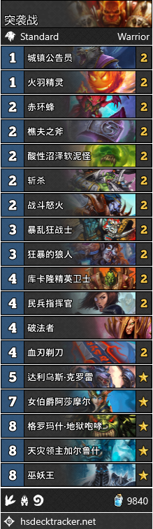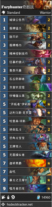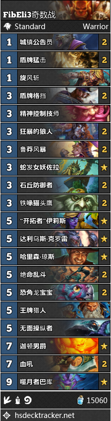 目前看来,奇数战可能是控制战士卡组最好的出路了。FibEli3在Furyhunter卡组的启发下,用一套带上了12张紫卡和6张橙卡的奇数战打到了传说第13名。开场叠甲、抗快攻卡和开拓者伊利斯的组合看起来还是挺靠谱的。