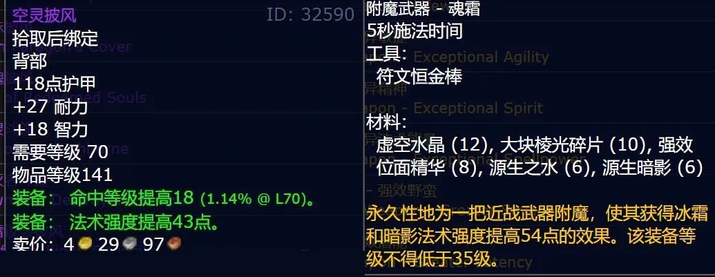 为什么只说元素萨、平衡德却不提其他法系DPS呢,这就引出了第二个知识点,WLK版本把所有只加单一种类法术伤害的装备改成的全伤,比如空灵披风53暗伤改成了43全伤,但是并没有改阳炎和魂霜武器附魔。因此只有平衡德和元素萨这两个有自然伤害的职业BIS附魔是43法强。