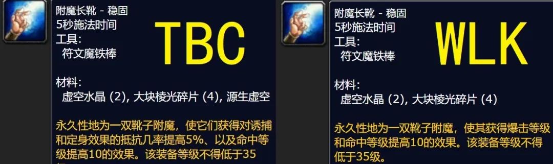 最后还有一个非常偏门的改动,附魔长靴稳固效果也改版了。改版后的附魔长靴稳固效果为提升10点暴击等级和10点命中等级,施法材料也去掉了一枚源生虚空。由于WLK版本统一了物理和法术暴击命中急速等级,改版后的附魔长靴稳固成为了全DPS职业毕业鞋子附魔,还没有稳固附魔图纸的玩家一定要去刷一张,卡拉赞歌剧院前的小怪掉落。