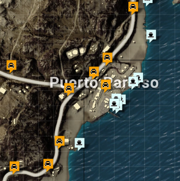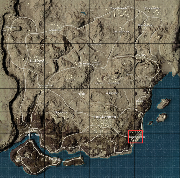 P港位于地图右下角,周围除了就近的几个野区之外不是海就是山。东面临海,沿着南北方向的公路可通向地图的右上和左下方区域,翻过西北的山坡不远处就是超级大城——Los Leones。