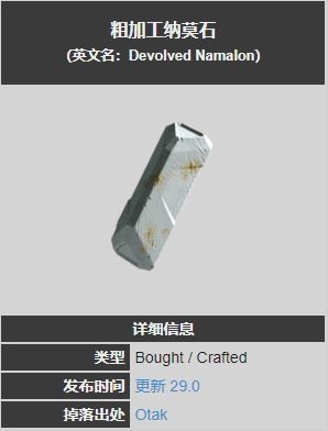 粗加工纳莫石是一种用于制作武器,装饰品以及殁世机甲部件的资源。制作需要消耗20个纳莫原石。