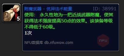使用附魔武器优异法术能量后可以永久性地为一把近战武器附魔,使其获得法术强度提高50点的效果。该装备等级不得低于60级。