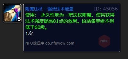 使用附魔法杖强效法术能量后可以永久性地为一把法杖附魔,使其获得法术强度提高81点的效果。该装备等级不得低于60级。