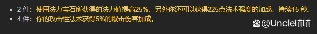 可以看到2件套装效果不仅让你使用法力宝石所获得的法力值提高25%,另外还让你获得持续15秒的225点法术强度加持,就这东西分明是暴雪给这亲儿子送了半个盘蛇饰带挂在脖子上啊。