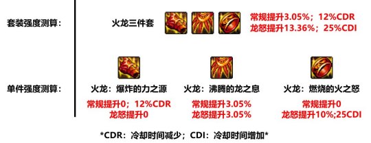在角色想要增加自身CDR时,可以考虑两种方法:(1)使用火龙项链+手镯,此时每秒获得7点火龙之息,在热机6s后即可吃到7s一周期的12%的CDR加成。在体验服测试时,发现在单挂火龙2持续攻击下,每次再次触发CDR效果前会有约1s的真空期。具体情况请以正式服为准。但考虑真空期下,火龙2也有较高的CDR覆盖率,因此仍然可以考虑使用。(2)直接成套使用火龙3,不开“龙怒”BUFF,此时热机时间只有3s,并且持续攻击下,CDR加成没有真空期。