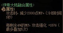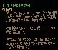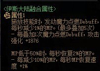 角色每剩余4%MP,给予1876点固定攻强,可叠加5次。并且在角色受到攻击时,固定减少5000点MP。另外每通过释放技能消耗5000MP,装备MP恢复效果增加10%