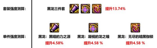 单件强度测算为角色无融合史诗视角下,增加一件融合史诗带来的提升。由于攻强的稀释特点,与套装提升率的关系并非单纯相加或相乘。该属性主要用于单件之间横向对比强度。