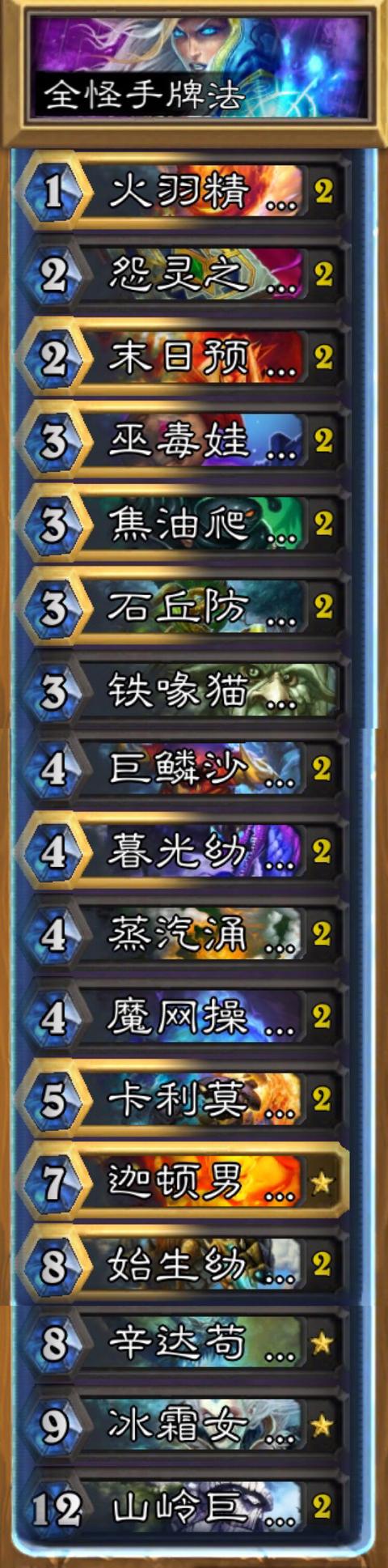 又试了几把,果然不出所料地奏效:4费前可靠怨灵书准时山岭,即使没抽到也还有火苗、石丘(这俩不亏手牌)、焦油站场;中期元素拉足卡差,最终女装大佬收尾。