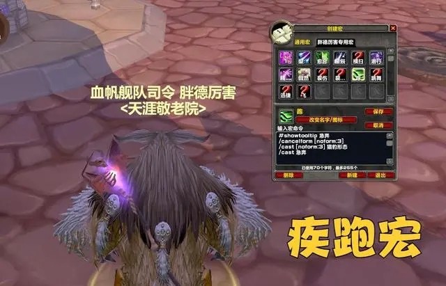 第三个宏是一键疾跑,点击之后会直接变成猫形态,然后开启疾跑。这个宏的价值主要在于副本中一些需要快速走位的地方,也可以把疾跑改成潜行,就是一键潜行了。