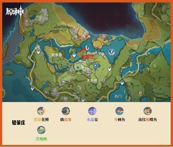 璃月共有七个钓鱼地点,分别是:轻策庄、望舒客栈、奥藏山、琥牢山、天遒谷。