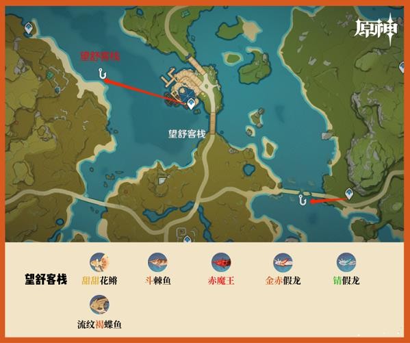 望舒客栈的鱼有:甜甜花鱂、斗棘鱼、赤魔王、金赤假龙、锖假龙。