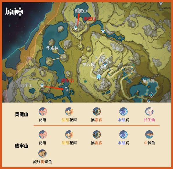 奥藏山的鱼有:花鱂、甜甜花鱂、擒霞客、水晶宴、长生仙。