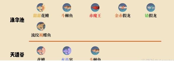 天遒谷的鱼有:花鱂、水晶宴、斗棘鱼。